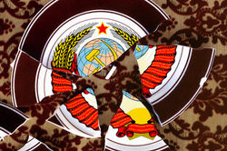 ![]() El escudo de la URSS, en representación a su desintegración, esta destruido en varios pedazos. | ![]() Esta es una imagen de un soldado izando la bandera de La Unión Sovietica. |